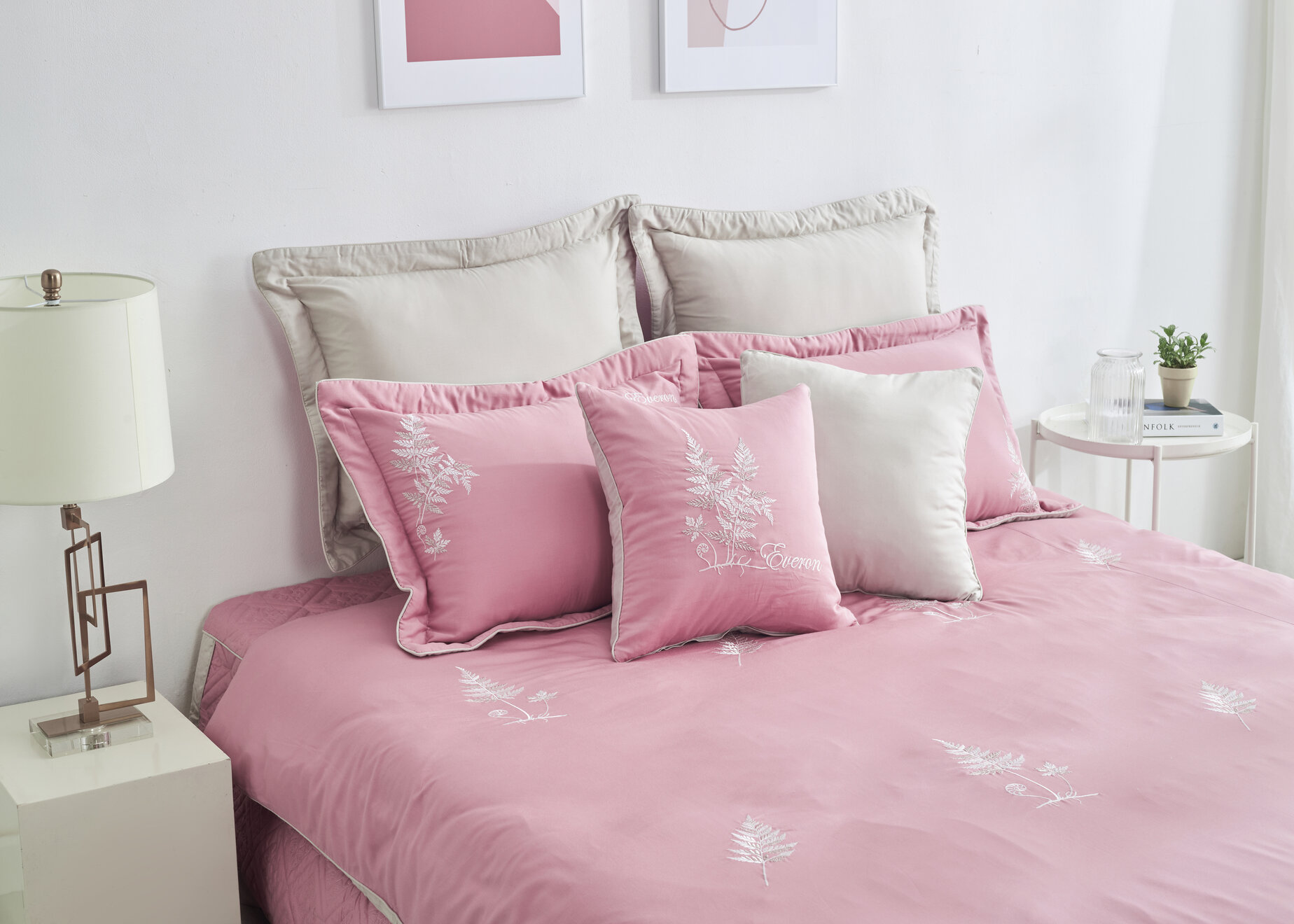 Những nhánh lá dương sỉ mảnh mai được thêu trên nền vải hồng nhạt, kết hợp cùng chỉ kim tuyến trắng lấp lánh như trên lá có một lớp nước đọng phản chiếu ánh sáng mặt trời. Hình thêu đơn giản đem đến cảm giác nền nã cho bộ chăn ga.