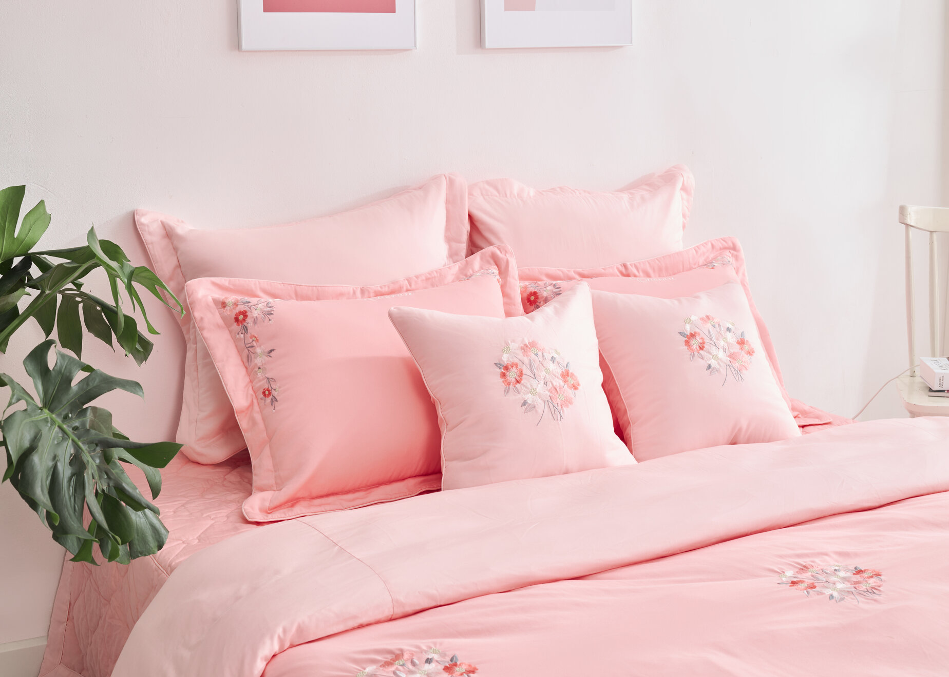 Bộ chăn ga ESM21015 đã rất sáng tạo khi dùng hình ảnh những chùm cúc dại thêu tỉ mỉ trên nền vải hồng cam – một màu sắc vô cùng ngọt ngào, dễ thương, tinh nghịch, lãng mạn, nữ tính và dịu dàng