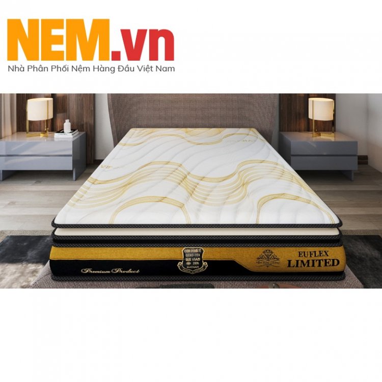 - Lõi Euflex Limited là các lò xo túi độc lập có độ dày 9cm xếp thành khối chắc chắn. Nguyên liệu thép không gỉ tiêu chuẩn Châu Âu được đưa vào máy uốn thành từng con lò xo nhỏ và đựng trong các túi vải không dệt độc lập nhằm tang độ cứng cáp cho kết cấu sản phẩm.